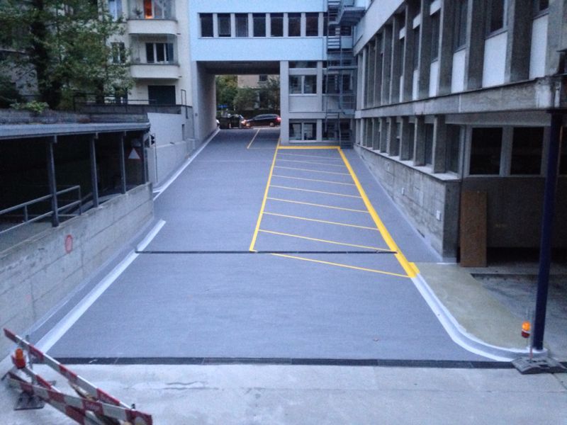 Da eine Vollsperrung im Parkdeck oder auf Rampen für Eigentümer oder Bewirtschafter meist keine Grundlage für eine Sanierung sein kann und darf. Und dafür gibt es effiziente Lösungen: Mit einem hochwertigen Flüssigkunststoff sind wir heutzutage in der Lage solche Sanierungen über mehrere kurze, schnelle Etappen oder durch Nachteinsätze zu bewerkstelligen. Ohne die Verkehr, Park- und Nutzungsflächen rapide zu beeinträchtigen.